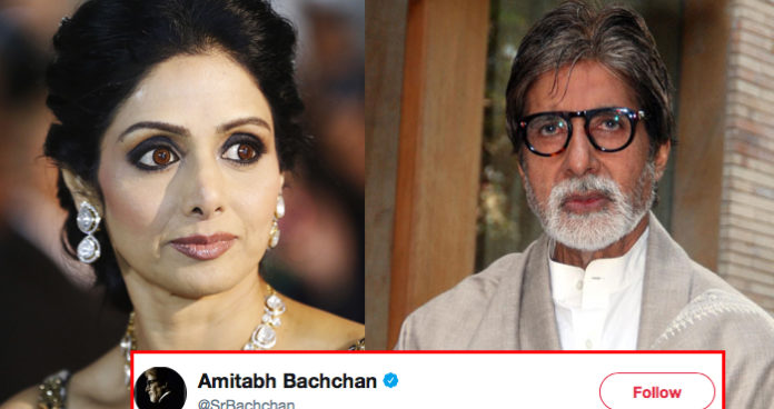 ಬಾಲಿವುಡ್ ಹಿರಿಯ ನಟಿ, ಮೋಹಕ ತಾರೆ ಶ್ರೀದೇವಿ ಅವರು ಹೃದಯಾಘಾತದಿಂದ ವಿಧಿವಶರಾದ ಸುದ್ದಿ ಬಹಿರಂಗವಾಗುವ ಕೆಲವೇ ಕ್ಷಣಗಳ ಮುನ್ನ ಬಾಲಿವುಡ್ ಮೆಗಾಸ್ಟಾರ್ ಅಮಿತಾಬ್ ಬಚ್ಚನ್ ಮಾಡಿದ್ದ ಟ್ವೀಟ್ ಈಗ ವೈರಲ್ ಆಗಿದೆ.
