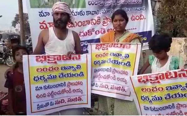 ಹೀಗೆ ಭಿಕ್ಷಾಟನೆಗೆ ಹೊರಟ ಕುಟುಂಬ ಕೈಯಲ್ಲಿ ಬ್ಯಾನರ್ಗಳನ್ನು ಹಿಡಿದು, ಅದರ ಮೇಲೆ ಭೂಮಿ ಪಡೆಯಲು ಲಂಚ ಕೊಡಬೇಕಾಗಿದೆ. ಅದಕ್ಕಾಗಿ ಹಣ ನೀಡಿ ಎಂದು ತೆಲುಗಿನಲ್ಲಿ ಬರೆಯಲಾಗಿದೆ. ಅದರ ಮೇಲೆ ರೈತನ ಮಕ್ಕಳ ಹೆಸರನ್ನೂ ನಮೂದಿಸಲಾಗಿದೆ.