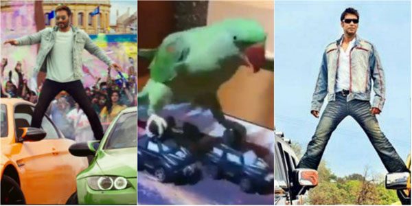 ಗಿಳಿಯೊಂದು ಎರಡು ಪುಟಾಣಿ ಕಾರುಗಳ ಮೇಲೆ ನಿಂತು ಹೋಗುತ್ತದೆ. ಇದು ಅಜಯ್ ದೇವಗನ್ ಗಿಳಿ ಎಂದು ಬರೆದು ಟ್ವಿಟ್ಟರ್ ನಲ್ಲಿ ಅಪ್ಲೋಡ್ ಮಾಡಲಾಗಿತ್ತು. ಈ ವಿಡಿಯೋವನ್ನು ರಿಟ್ವೀಟ್ ಮಾಡಿಕೊಂಡಿರುವ ಅಜಯ್ ದೇವಗನ್, ಮೆಚ್ಚುಗೆ ಸೂಚಿಸಿದ್ದಾರೆ. ಗಿಳಿ ಕಾರಿನ ಮೇಲೆ ಸ್ಟಂಟ್ ಮಾಡಿದ್ದನ್ನು, ಹಾರೋದನ್ನ ಮರೆತ ಹಾಗಿದೆ ಎಂದು ಬರೆದುಕೊಂಡಿದ್ದಾರೆ.