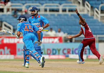 West Indies won by 1 wicket against India in 47.4 overs after India was put into bat to score 229 for seven in a Celkon Mobile Cup Tri—series match in Kingston on Monday.
