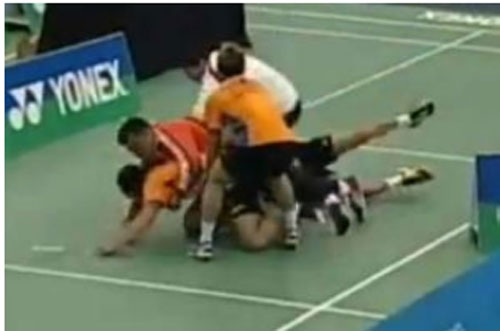 Video footage showed Bodin chasing Maneepong, his partner at last year’s Olympics but now teamed with Nipitphon Puangpuapech, on to a neighbouring court and dragging him to the ground.