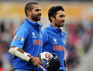 Karthik-Dhawan duo put on a 108-run stand for the third wicket from only 18.2 overs as they helped consolidate the team’s position after they were reduced to 34 for two at one stage losing Rohit Sharma and skipper Cheteshwar Pujara.