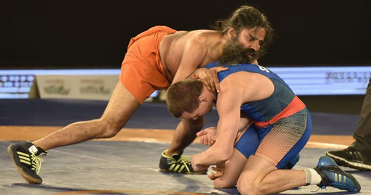 ಬುಧವಾರ ಪ್ರೊ ಕುಸ್ತಿ ಲೀಗ್’ನ 2ನೇ ಸೆಮಿಫೈನಲ್ ಪಂದ್ಯದ ವೇಳೆ ನಡೆದ ಸೌಹಾರ್ದ ಪಂದ್ಯದಲ್ಲಿ ರಾಮ್’ದೇವ್ ತಮ್ಮ ಪವರ್ ತೋರಿಸಿದರು. ಒಲಿಂಪಿಕ್ಸ್ ಪದಕ ವಿಜೇತನನ್ನು 12-0 ಅಂತರದಿಂದ ಆ್ಯಂಡ್ರೆ ಸ್ಟಾಡ್ನಿಕ್ ರನ್ನು ಸೋಲಿಸಿದರು. ಯೋಗದಲ್ಲಿ ಎಷ್ಟು ಶಕ್ತಿ ಇದೆ ಎನ್ನುವುದನ್ನು ತೋರಿಸುವ ಸಲುವಾಗಿ ಒಲಿಂಪಿಕ್ಸ್ ಪದಕ ವಿಜೇತನ ವಿರುದ್ಧ ಹೋರಾಡಿದೆ ಎಂದು ರಾಮ್ದೇವ್ ತಿಳಿಸಿದ್ದಾರೆ.