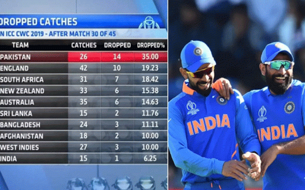 ಒಟ್ಟು 26 ಕ್ಯಾಚ್ನಲ್ಲಿ 14 ಕ್ಯಾಚ್ಗಳನ್ನು ಕೈಚೆಲ್ಲಿ ಮೊದಲ ಸ್ಥಾನದಲ್ಲಿದ್ದಾರೆ ಪಾಕಿಸ್ತಾನ. ಬಳಿಕ ಇಂಗ್ಲೆಂಡ್ 10 ಕ್ಯಾಚ್ ಬಿಟ್ಟರೇ, ದಕ್ಷಿಣ ಆಫ್ರಿಕಾ 7 ಕ್ಯಾಚ್, ನ್ಯೂಜಿಲೆಂಡ್ ತಂಡ 6, ಭಾರತ ತಂಡ 15ರಲ್ಲಿ ಕೇವಲ ಒಂದು ಕ್ಯಾಚ್ ಮಾತ್ರ ಕೈಚೆಲ್ಲಿದ್ದಾರೆ.