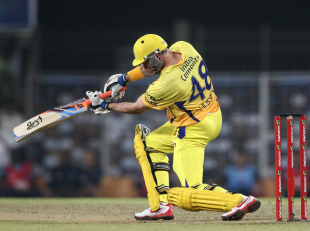 Bravo and S Badrinath added 58 for the fourth wicket, with the West Indies allrounder bringing out his famous lofted shots on the off-side – he struck two inside-out sixes over cover. He fell, and was followed by Dhoni and Jadeja too, but Albie Morkel eased any nerves by picking up the winning runs in the 19th over.