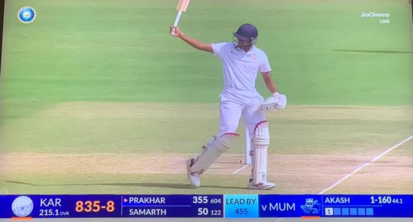 ಪ್ರಖರ್ ಒಟ್ಟು 638 ಎಸೆತಗಳನ್ನು ಎದುರಿಸಿದರು. 46 ಬೌಂಡರಿ ಹಾಗೂ ಮೂರು ಸಿಕ್ಸರ್ ಹೊಡೆದರು. ತಂಡವು 8 ವಿಕೆಟ್ಗಳಿಗೆ 890 ರನ್ಗಳ ದಾಖಲೆಯ ಮೊತ್ತ ಬಾರಿಸಿತು.