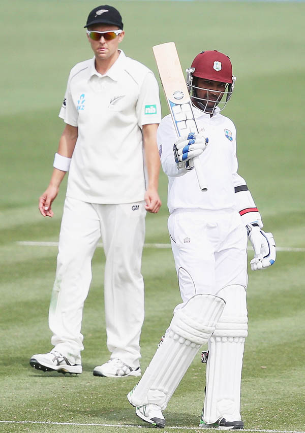 It was Tim Southee who kickstarted the drama soon after lunch. Brathwaite had been tentative often but had survived through some pluck and some fortune to proceed to 45. But when Southee dug it in short, Brathwaite’s awkward style conspired to send the ball to gully. Southee was bowling some big outswingers now, and Kirk Edwards feathered one of them behind while trying to leave it, and was given out after New Zealand reviewed. Marlon Samuels flayed irresponsibly at his ninth delivery to edge to gully for a duck and Narsingh Deonarine missed a clip to be caught in front.