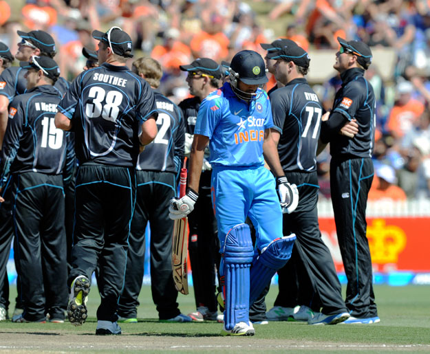 India’s Rohit Sharma walks out for 79 as the New Zealand team watch the replay of the dismissal on the big screen in the fourth one-day international cricket match at Seddon Park in Hamilton, New Zealand.- AP
