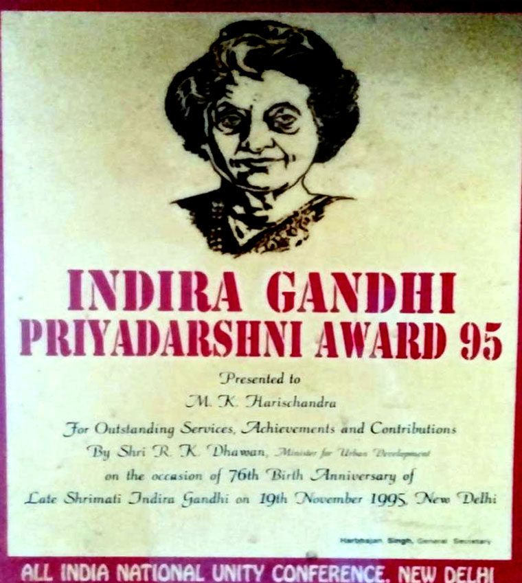 ಉದ್ಯಮದಲ್ಲಿ ಇವರ ಸೇವೆಯನ್ನು ಗುರುತಿಸಿದ ಅಂದಿನ ಕೇಂದ್ರ ಸರಕಾರ ಮಾಜಿ ಪ್ರಧಾನಿ ದಿ. ಇಂದಿರಾ ಗಾಂಧೀಯವರ76ನೇ ಜನ್ಮದಿನಾಚರಣೆ ಸಂದರ್ಭ (19th ನವೆಂಬರ್1995) ದೆಹಲಿಯಲ್ಲಿ ನಡೆದ ಸಮಾರಂಭದಲ್ಲಿ ಶ್ರೀ ಎಂ.ಕೆ. ಹರಿಶ್ಚಂದ್ರ ಅವರಿಗೆ ಉದ್ಯಮದಲ್ಲಿ ಅತ್ಯುತ್ತಮ ಸೇವೆ ಹಾಗೂ ಕೊಡುಗೆಗಳನ್ನು ನೀಡಿದವರಿಗೆ ಕೊಡಲ್ಪಡುವ ಅತ್ಯುತ್ತಮ ಸಾಧಕ ಪ್ರಶಸ್ತಿಯಾದ “ಇಂದಿರಾ ಗಾಂಧೀ ಪ್ರಿಯದರ್ಶಿನಿ ರಾಷ್ಟ್ರೀಯ ಪ್ರಶಸ್ತಿ” ನೀಡಿ ಗೌರವಿಸಿದೆ.