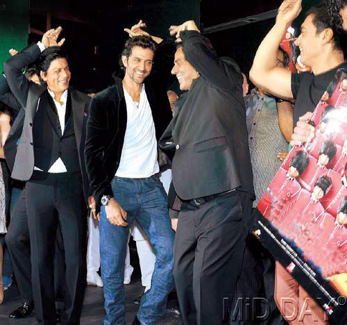 At one point at the event there were so many star guests on the stage that it seemed difficult to accommodate all of them. Dharmendra was slated to perform dance number on one of the special songs in the film, but he couldn’t possibly do it because of lack of space as the stage was teeming with guests. Instead, Dharmendra made SRK, Aamir, Hrithik dance to his tune. King Khan was the first one to get into a jig, promptly followed by Hrithik and Aamir.