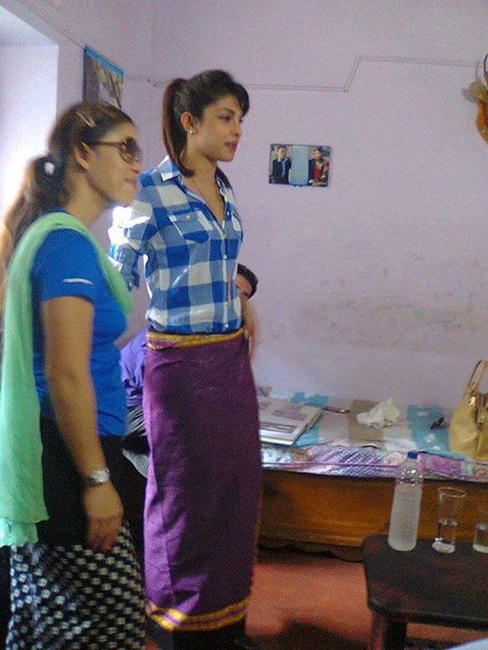 Bollywood actress Priyanka Chopra visited the hilly state of Manipur (India) to meet Indian boxing champion, Mary Kom, at her official quarters in Langol, Imphal.