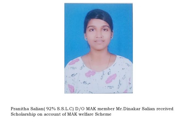 Scholarship of INR.10,000 was given to Miss Pranitha D Salian daughter of active member Mr. Dinakar C. Salian who has scored 92% in S.S.L.C. 2020.