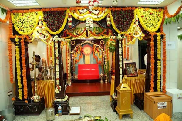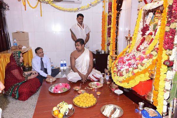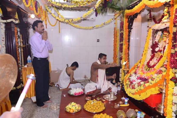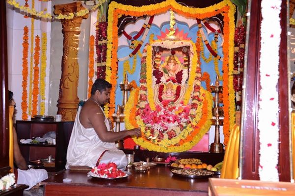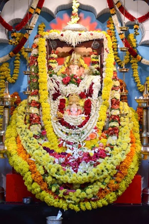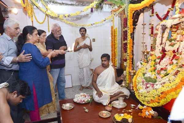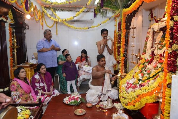 The temple hall entrance was decorated traditionally with banana stems, mango leaves, cluster of tender coconuts, bunches of dates and flowers. The alcoves on the ceilings of the entire hall were adorned beautifully in fresh flower garlands in an artistic pattern, with light and dark hued flowers alternately arranged. Around 300 kg of fresh flowers of different varieties and colours were flown in from Bangalore and Mangalore. Fresh flower garlands of Mangalore Malige, Roses, Jasmine, Lotus, Kewra, Marigold, Zeenia, etc adorned the idol of Lord Ganesha on all the three days. A rare opportunity for the devotees to witness such a beautiful floral decoration and it was a mesmerizing treat to the eyes. The entire decoration was aesthetically created by a team of enthusiastic, creative volunteers mainly Ravi Kanchan, Vittal Pujari, Satish Pujari, Mahesh Bangera, Vasant Sherigar, Vijayraj, Abhijith Khalasi, led by Koni Prakash Naik.
