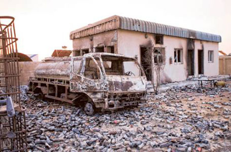 Gulf News visited the site and a strong chemical, bug spray-like smell still lingered in the warm evening air. It could be felt — almost tasted — in the back of the throat. Countless burnt-out cans covered the ground, and were found heaped like small hills inside the skeletal remains of the building.