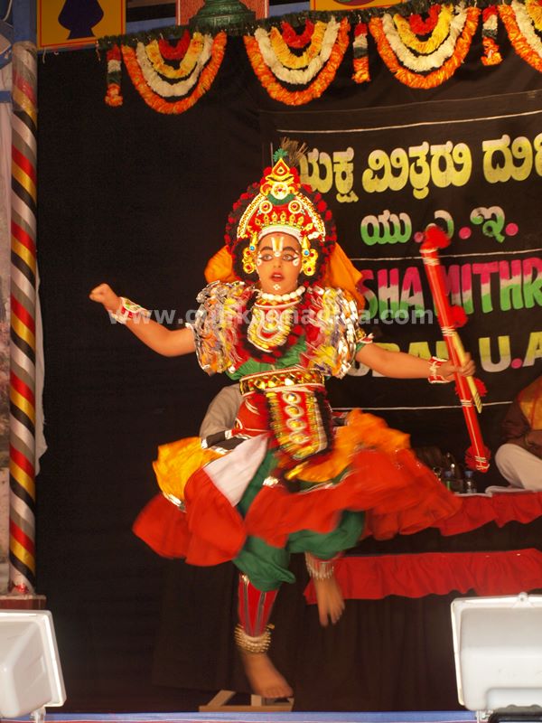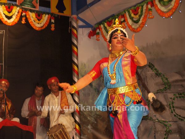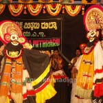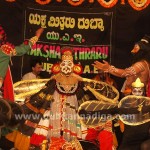 Another impressive performance by Ravindra Uchila, a local artist as “Jaabali” with his own style of astounding dance, amazing dialogues justified his role. Shekar Shettigar as”Arunasura” with his classical dance, meaningful deliberations, varied expressions of the nine sentiments of poetic composition( Navarasa) exhibited his talent brilliantly in such a way that as if demon has descended from the heaven in reality.