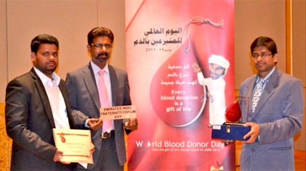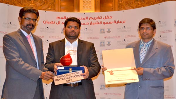 Emirates India Fraternity Forum has got special appreciation & thanks to its commendable services in organizing blood donation camps across Abu Dhabifrom Ministry of Health,Abudhabi on the occasion of World Blood Doner Day held by Abudhabi Blood Bank. EIFF has been felicitated and bestowed with memento in a ceremony honoring the frequent donors and establishments in supporting activities of ADBB which is under the patronage of Sheikh Hamdan bin Zayed Al NahyanRuler’s Representative in the Western region Abu Dhabi at Emirates Palace Hotel Abudhabi, on 13th June 2013.