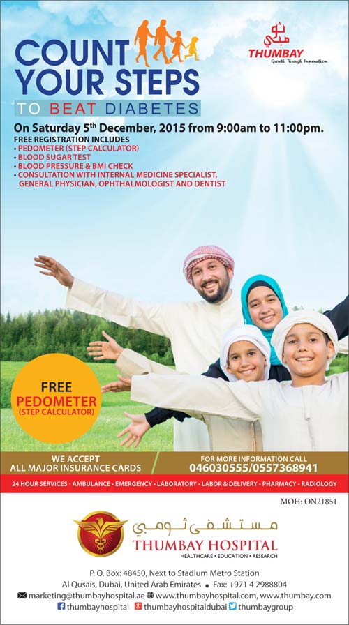 Thumbay Hospital – Dubai, the ultra-modern academic hospital owned by Thumbay Group will hold a unique diabetes awareness program themed “Count Your Steps – To Beat Diabetes” at the hospital from 9 am to 11 pm on Saturday, 5th December 2015.
