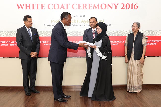 Ajman: Gulf Medical University ceremoniously conducted the White Coat Ceremony- 2016 for 258 students, from 75 countries, at the University Campus in Ajman on the 29th September 2016. The event drew nearly 500 family members and friends for the rite of passage, as each new medical student in the Class of 2016 donned a coat.