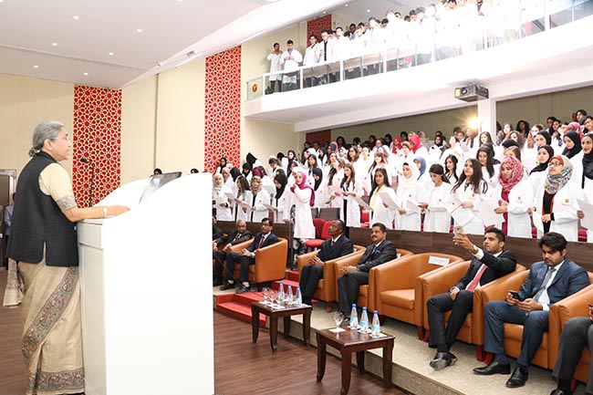 The Founder President of Gulf Medical University, Mr. Thumbay Moideen and the faculty members of the University welcomed a total of 258 students newly admitted to the MBBS, BPT, BHS, DMD and PHARM D Programs and conferred the “White Coats” as a symbol of their entry into their chosen professions.