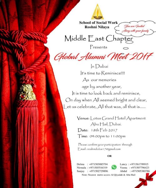 Dubai: Alumni of School of social work, Roshni Nilaya, Middle East Chapter, will hold its 1st Global meet for all Roshnites around the world, on Saturday, February 18, at Lotus Grand Hotel Apartment , Dubai. The association invites all Roshnites to this event to spend an evening with their faculty members present in Dubai.