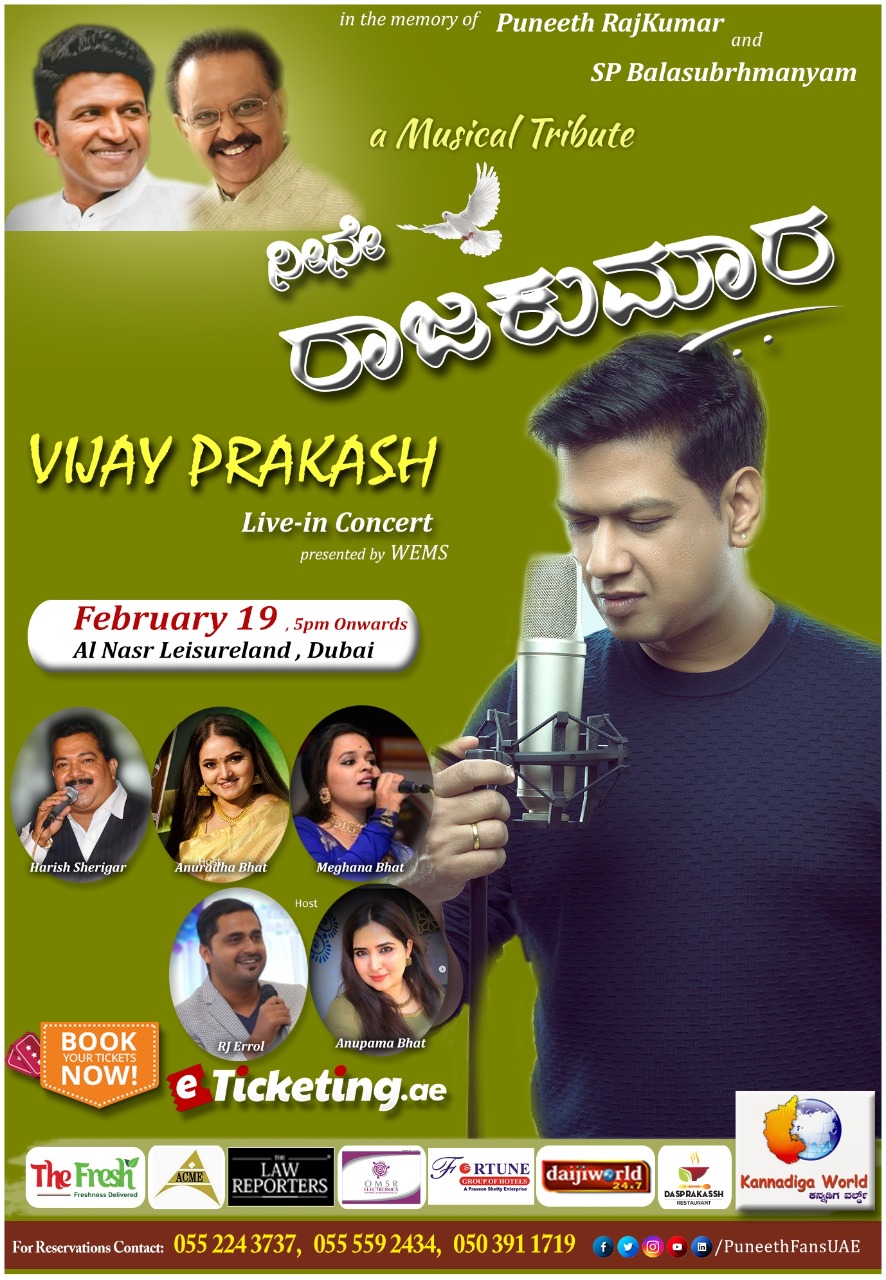 ದುಬೈನ ಪುನೀತ್ ರಾಜಕುಮಾರ್ ಅಭಿಮಾನಿಗಳು ಆಯೋಜಿಸುತ್ತಿರುವ ಈ ಸಂಗೀತ ಸಂಜೆ ಕಾರ್ಯಕ್ರಮದಲ್ಲಿ ಭಾಗವಹಿಸಲು ಇಚ್ಛಿಸುವವರು ಈ ಕೆಳಗಿನ ಸಂಖ್ಯೆಗಳನ್ನು ಸಂಪರ್ಕಿಸಬಹುದು 0552443737, 0555592434, 050 3911719. ಅಥವಾ ನೇರವಾಗಿ http://www.eticketing.ae ಮೂಲಕ ಟಿಕೆಟ್ ಕಾದಿರಿಸಬಹುದು.