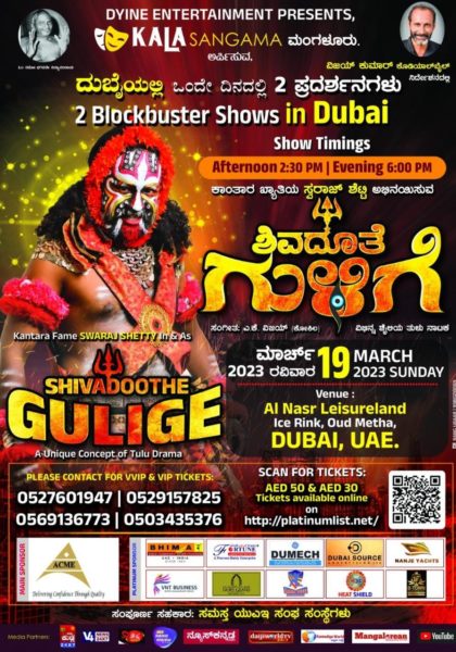 ಮಾರ್ಚ್ 19 ರಂದು ನಗರದ ಉದ್ ಮೇತದ ಅಲ್ ನಸರ್ ಲ್ಯಾಂಡ್ ನ ಐಸ್ ಲಿಂಕ್ ನಲ್ಲಿ ಮಧ್ಯಾಹ್ನ 2.30 ಮತ್ತು ಸಂಜೆ 6. 30 ಗಂಟೆಗೆ “ಶಿವದೂತೆ ಗುಳಿಗೆ” ನಾಟಕದ ಯಶಸ್ವಿ ಪ್ರದರ್ಶನವಾಗಲಿದೆ. ಈಗಾಗಲೇ ತುಳುನಾಡು, ಕರುನಾಡು ಹಾಗೂ ಗಡಿನಾಡಿನಲ್ಲಿ 420 ಕ್ಕೂ ಮಿಕ್ಕಿ ಪ್ರದರ್ಶನಗೊಂಡಿದೆ.