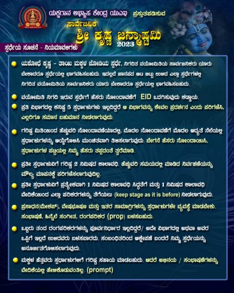 ಸಾರ್ವಜನಿಕರಿಗಾಗಿ ವಿವಿಧ ವಯಸ್ಸಿನ ಮಕ್ಕಳಿಗಾಗಿ ಯಶೋಧೆ ಕೃಷ್ಣ, ಮುದ್ದುಕೃಷ್ಣ, ಬಾಲಕೃಷ್ಣ ವೇಷ ಸ್ಪರ್ಧೆಯ ಜೊತೆಗೆ, ಅಭ್ಯಾಸ ಕೇಂದ್ರದ ವಿದ್ಯಾರ್ಥಿಗಳು, ಕಲಾವಿದರು ಮತ್ತು ಹೆತ್ತವರನ್ನೊಳಗೊಂಡ ನಾಲ್ಕು ತಂಡಗಳು ಕಿಶೋರ ಕೃಷ್ಣ ಎಂಬ ವಿಶಿಷ್ಟ ಸ್ಪರ್ಧಾ ಕಾರ್ಯಕ್ರಮದ ಮೂಲಕ ಭಕ್ತಮಹಾಶಯರ ಸಮ್ಮುಖದಲ್ಲಿ ಅತ್ಯದ್ಭುತವಾಗಿ ಕೃಷ್ಣ ಕಥೆಗಳನ್ನು ಪ್ರಸ್ತುತ ಪಡಿಸಲಿದ್ದಾರೆ.