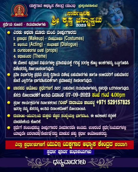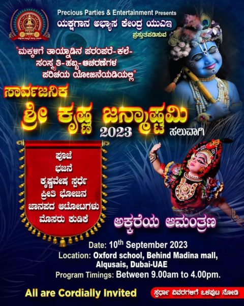 ದುಬೈ: ಯಕ್ಷಗಾನ ಅಭ್ಯಾಸ ಕೇಂದ್ರ ಯುಎಇ ಪ್ರಾಯೋಜಕತ್ವದಲ್ಲಿ, ‘ಮಕ್ಕಳಿಗೆ ತಾಯ್ನಾಡಿನ ಪರಂಪರೆ-ಕಲೆ- ಸಂಸ್ಕೃತಿ-ಹಬ್ಬ-ಆಚರಣೆಗಳ ಪರಿಚಯ ಯೋಜನೆಯಡಿಯಲ್ಲಿ’ ಕಳೆದ ಕೆಲ ವರ್ಷಗಳಿಂದ ಆಚರಿಸಿಕೊಂಡು ಬರುತ್ತಿರುವಂತೆ, ಮತ್ತಷ್ಟು ವೈಭವ-ಸಡಗರ ಮತ್ತು ನವರೂಪದಿಂದ ಈ ಬಾರಿ ಕೂಡ ‘ಸಾರ್ವಜನಿಕ ಶ್ರೀ ಕೃಷ್ಣ ಜನ್ಮಾಷ್ಟಮಿ -2023’ ಆಚರಣೆಗೆ ಸರ್ವ ಸಿದ್ಧತೆಗಳನ್ನು ಮಾಡಿಕೊಳ್ಳಲಾಗಿದೆ.