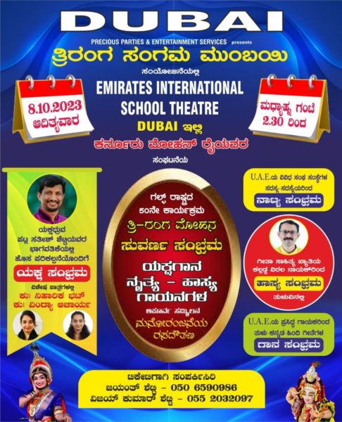 ಕರ್ನೂರು ಮೋಹನ್ ರೈಯವರ ಸಂಚಾಲಕತ್ವದ ಗಲ್ಫ್ ರಾಷ್ಟ್ರದ 50 ನೇ ಕಾರ್ಯಕ್ರಮ “ತ್ರಿರಂಗ ಮೋಹನ ಸಂಭ್ರಮ” ಎಂಬ ಕಾರ್ಯಕ್ರಮವು ದುಬೈನ ಎಮಿರೆಟ್ಸ್ ಇಂಟರ್ ನೇಶನಲ್ ಸ್ಕೂಲ್ ನಲ್ಲಿ ಮಧ್ಯಾಹ್ನ 2.30 ಗಂಟೆಗೆ ಆರಂಭವಾಗಲಿದೆ.