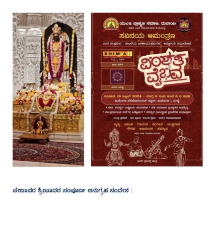 With the blessings of Rajarshi Shree Veerendra Heggade, this year 20th ‘Vimshathi’ Annual Celebration started with holistic New Year ‘Ugadi’ Shree Satyanarayana Pooja continued with various celebrations throughout the year with varieties of unique programmes. Along with the usual poojas conducted ‘Kishora Kaushalya’ for the tiny aspirants of all communities, ‘Makkala Manadangala’ for children, ‘Natya Sinchana’ for the elder dance enthusiasts, ‘Mussanja Maadurya’ for the aspirant vocalists, ‘Yaksha Maddale’ (Taala Maddle) to keep the Fork Art live, ‘Joshiyavara Jyothealli’ veneration with Dr. Joshi, ‘Saadhaka Sammana’ to Ex-Minister Raghupathi Bhat, Nrityaguru Karnataka Kalashree Vidwan Chandrashekar Navada, Senior Yakshagana exponent Madhoor Radhakrishna Navada, ‘Chende Vadhaka’ Padmanabh Upadyaya, ‘Maddalegara’ Chaitanya Padyana, Multi-faceted ‘Yaksharadhaki’ Sumangala Ratnakar, “Guru Gaurava” felicitation for all those visiting Purohits, Special event with ‘Varamahalakshmi Pooja’, ‘Tulasi Pooja’, invited all Communities and conducted ‘Rangoli Competition’ which were all part of the procession of events concluded in the celebration of ‘Vimshathi Uthsava’ and the last of it is awaited to be conducted in an extravaganza being the final event for which all preparations are being actively going on to present on 13th of April, 2024.