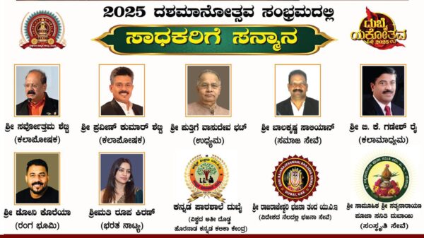 ದಶಮಾನೋತ್ಸವ ಸಂಭ್ರಮದಲ್ಲಿ ವಿವಿಧ ಕ್ಷೇತ್ರಗಳಲ್ಲಿ ಸಾಧನೆ ಮಾಡಿರುವ ಯು.ಎ.ಇ.ಯ ಹತ್ತು ಸಾಧಕರಿಗೆ ಸನ್ಮಾನಿಸಿ ಗೌರವಿಸಲಾಗುವುದು, ಶ್ರೀಯುತರುಗಳಾದ ಸರ್ವೋತ್ತಮ ಶೆಟ್ಟಿ, ಪ್ರವೀಣ್ ಕುಮಾರ್ ಶೆಟ್ಟಿ, ಪುತ್ತಿಗೆ ವಾಸುದೇವ ಭಟ್, ಬಾಲಕೃಷ್ಣ ಸಾಲಿಯಾನ್, ಬಿ. ಕೆ. ಗಣೇಶ್ ರೈ, ಡೋನಿ ಕೊರೆಯಾ, ಶ್ರೀಮತಿ ರೂಪಾ ಕಿರಣ್ ಮತ್ತು ಸಂಸ್ಥೆಗಳಾದ ಕನ್ನಡ ಪಾಠ ಶಾಲೆ ದುಬಾಯಿ, ಶ್ರೀ ರಾಜರಾಜೇಶ್ವರಿ ಭಜನಾ ತಂಡ ಯು.ಎ.ಇ. ಹಾಗೂ ಸಾರ್ವಜನಿಕ ಶ್ರೀ ಸತ್ಯನಾರಾಯಣ ಪೂಜಾ ಸಮಿತಿ ಯು.ಎ.ಇ. ಹಾಗೂ ಇನ್ನಿತರ ವೈವಿಧ್ಯ ಕಲಾ ಕಾರ್ಯಕ್ರಮಗಳು ದಿನ ಪೂರ್ತಿ 2025 ಜೂನ್ 29 ರಂದು ಕರಾಮದ ಶೇಖ್ ರಷೀದ್ ಅಡಿಟೋರಿಯಂನಲ್ಲಿ ವೈಭವದ ಆಯೋಜನೆಯ ಮೂಲಕ ಐತಿಹಾಸಿಕ ಸಾಕ್ಷಿಯಾಗಿ ನಿಲ್ಲುವ ಸದವಸರದಲ್ಲಿ ಯಕ್ಷಗಾನ ಅಭ್ಯಾಸ ಕೇಂದ್ರ ಯು ಎ ಇ. ಸಂಸ್ಥೆ ನಡೆದು ಬಂದ ದಾರಿ ಅರಬ್ ಸಂಯುಕ್ತ ಸಂಸ್ಥಾನದಲ್ಲಿ ನೆಲೆಸಿರುವ ಅನಿವಾಸಿ ಭಾರತೀಯ ಯಕ್ಷಗಾನ ಪ್ರೇಮಿಗಳ ಮುಂದೆ ಐತಿಹಾಸಿಕ ಸಾಕ್ಷಿಯಾಗಲಿದೆ.