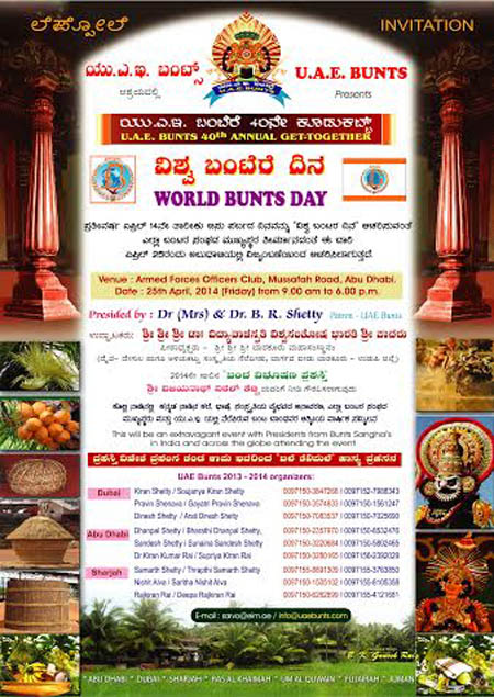 World Bunts Day – 2014, 40th annual get-together will be organized by UAE Bunts at Armed Forces Officers Club auditorium, Abu Dhabi on Friday April 25. The heads of worldwide Bunts Sangha will be the specially-invited guests present on the occasion.