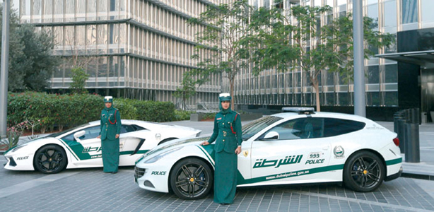 Emirati female police officers pose in front of Ferrari (right) and Lamborghini police vehicles at the foot of Burj Khalifa in Dubai . Dubai police showed off a new Ferrari that they will use to patrol the city, hot on the heels of a Lamborghini, which joined the fleet earlier. The cars will be used by women police to patrol tourist areas.
