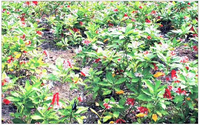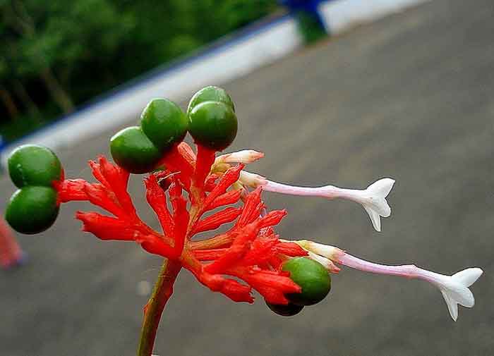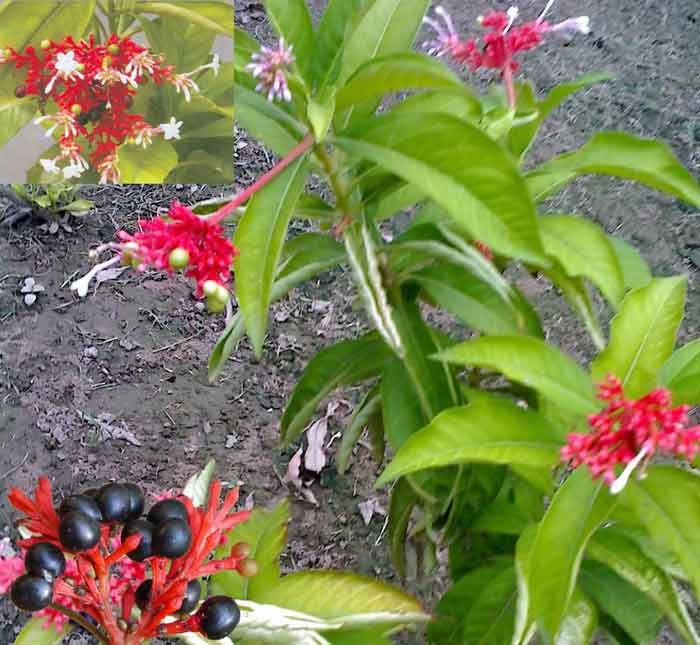 ಉಜ್ವಲ ಹಸಿರಿನ, ಹೊಳಪುಳ್ಳ ಎಲೆಗಳು, ಕೆಂಪು ಪುಷ್ಪಪತ್ರದ ಬಿಳಿಯ ಛಾಯೆಯ ಹೂಗಳು ಇದರ ಪ್ರಮುಖ ಲಕ್ಷಣ. ಇದು ಎರಡರಿಂದ ಮೂರು ಅಡಿ ಎತ್ತರ ಬೆಳೆಯುತ್ತದೆ.ಇದರ ಎಲೆ ನಾಲ್ಕರಿಂದ ಆರು ಅಂಗುಲ ಉದ್ದ, ಸುಮಾರು ಒಂದೂವರೆಯಿಂದ ಎರಡು ಅಂಗುಲ ಅಗಲವಿದ್ದು, ಹಸಿರು ಹೊಳಪನ್ನು ಹೊಂದಿರುತ್ತದೆ. ಹೂಗಳು ಗೊಂಚಲು ಗೊಂಚಲಾಗಿ ಬಿಡುವಂತಿದ್ದು, ಗುಲಾಬಿ ಅಥವಾ ಬಿಳಿಯ ಬಣ್ಣ ದಿಂದ ಕೂಡಿರುತ್ತವೆ. ಕಾಯಿಗಳು ನಾಟಿ ಬಟಾಣಿಯ ಗಾತ್ರದಲ್ಲಿದ್ದು ಪ್ರಾರಂಭದಲ್ಲಿ ಹಸಿರಾಗಿದ್ದು,ಹಣ್ಣಾದಾಗ ಕಪ್ಪುಬಣ್ಣಕ್ಕೆ ತಿರುಗುತ್ತವೆ.