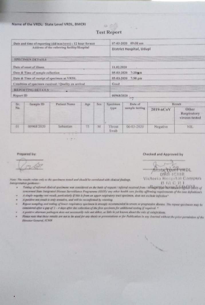 ಉಡುಪಿ: ಇಸ್ರೇಲ್ ನಿಂದ ಉಡುಪಿಗೆ ಆಗಮಿಸಿದ್ದ ಸುಮಾರು 75 ವರ್ಷದ ವ್ಯಕ್ತಿಗೆ ಕೆಮ್ಮು ಹಾಗೂ ಶೀತದ ತೊಂದರೆಯಿರುವ ಖಚಿತ ಮಾಹಿತಿ ಅನ್ವಯ ಉಡುಪಿ ಜಿಲ್ಪಾಸ್ಪತ್ರೆಗೆ ದಾಖಲಾಗಿದ್ದು, ಶಂಕಿತ ಕೊರೊನಾ ವೈರಸ್ ಲಕ್ಷಣಗಳ ಹಿನ್ನೆಲೆಯಲ್ಲಿ, ಈ ರೋಗಿಯ ಥ್ರೋಟ್ ಸ್ವಾಬ್ ನ್ನು ಪರೀಕ್ಷೆಗಾಗಿ ಬೆಂಗಳೂರಿಗೆ ಕಳುಹಿಸಿದ್ದು, ಇಂದು ಆ ವ್ಯಕ್ತಿಯ ವೈದ್ಯಕೀಯ ವರದಿಯು ಜಿಲ್ಲಾಡಳಿತ ಕೈ ಸೇರಿದ್ದು, ವರದಿಯಲ್ಲಿ ನೆಗೆಟಿವ್ ಎಂದು ಬಂದಿರುವುದರಿಂದ, ಜಿಲ್ಲೆಯ ಸಾರ್ವಜನಿಕರು ಯಾವುದೇ ಆತಂಕಗೊಳಗಾಗುವ ಅಗತ್ಯವಿಲ್ಲ. ಆದರೆ ಈ ರೋಗದ ಲಕ್ಷಣಗಳನ್ನು ತಿಳಿದುಕೊಂಡು ಅಗತ್ಯ ಮುಂಜಾಗೃತ ಕ್ರಮಗಳನ್ನು ಕೈಗೊಳ್ಳುವಂತೆ ಜಿಲ್ಲಾಧಿಕಾರಿ ಜಿ.ಜಗದೀಶ್ ತಿಳಿಸಿದ್ದಾರೆ.
