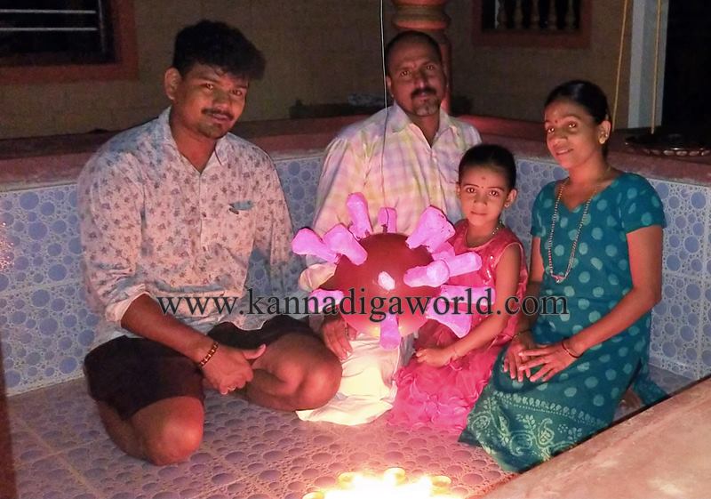 ಪ್ರಧಾನಿ ಮೋದಿ ಕೊಟ್ಟ ಕರೆಗೆ ಕುಂದಾಪುರ ತಾಲೂಕಿನ ಗೋಪಾಡಿ ಗ್ರಾಮದ ಜೀವಿ ಆರ್ಟ್ಸ್ ಸಂಸ್ಥೆ ಮಾಲಿಕ ಜೀವಿ ವೆಂಕಟೇಶ್ ಆಚಾರ್ಯ ಅವರ ನಿವಾಸದಲ್ಲಿ ವಿಭಿನ್ನ ರೀತಿಯಲ್ಲಿ ಕೊರೋನಾ ವಿರುದ್ಧ ಜಾಗ್ರತಿ ಹೋರಾಟ ಮಾಡಲಾಯಿತು. ಜೀವಿ ಆರ್ಟ್ಸ್ ಸಂಸ್ಥೆ ಮ್ಯಾನೇಜರ್ ವಿನೇಂದ್ರ ಆಚಾರ್ಯ ಅವರು ಕೊರೋನಾ ಪ್ರತಿಕೃತಿಯನ್ನು ರಚಿಸಿದ್ದು ಅದನ್ನು ಮಾಲಿಕರ ನಿವಾಸದಲ್ಲಿ ಭಾನುವಾರ ರಾತ್ರಿ ಸರಿಯಾಗಿ 9 ಗಂಟೆ.. 9 ನಿಮಿಷಕ್ಕೆ 9 ದೀಪಗಳ ಸಹಕಾರದಲ್ಲಿ ದಹಿಸುವ ಮೂಲಕ ಹೆಮ್ಮಾರಿ ಕೊರೋನಾ ತೊಲಗಲಿ ಎಂದು ಪ್ರಾರ್ಥಿಸಲಾಯಿತು.