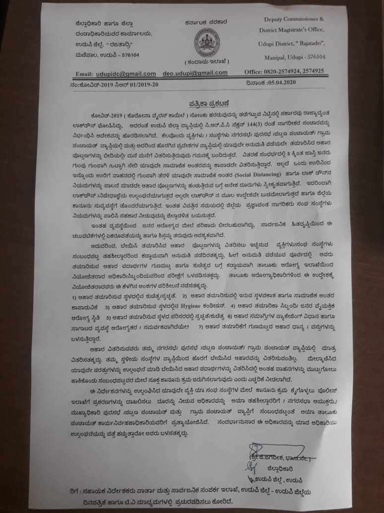 ಉಡುಪಿ: ಕೋವಿಡ್-2019 ( ಕೊರೋನಾ ವೈರಸ್ ಕಾಯಿಲೆ ) ಸೋಂಕು ಹರಡುವುದನ್ನು ತಡೆಗಟ್ಟುವ ನಿಟ್ಟಿನಲ್ಲಿ ಸರ್ಕಾರವು ರಾಜ್ಯಾದ್ಯಂತ ಲಾಕ್ಡೌನ್ ಘೋಷಿಸಿದ್ದು, ಅದರಂತೆ ಉಡುಪಿ ಜಿಲ್ಲಾ ವ್ಯಾಪ್ತಿಯಲ್ಲಿ ಸಿ.ಆರ್.ಪಿ.ಸಿ ಸೆಕ್ಷನ್ 144(3) ರಂತೆ ನಾಗರೀಕರ ಸಂಚಾರವನ್ನು ನಿರ್ಭಂಧಿಸಿ ಆದೇಶವನ್ನು ಹೊರಡಿಸಲಾಗಿದೆ. ಕೆಲವೊಂದು ವ್ಯಕ್ತಿಗಳು / ಸಂಸ್ಥೆಗಳು ನಗರಸಭೆ/ ಪುರಸಭೆ /ಪಟ್ಪಣ ಪಂಚಾಯತ್/ ಗ್ರಾಮ ಪಂಚಾಯತ್ ವ್ಯಾಪ್ತಿಯಲ್ಲಿ ಮತ್ತು ಅದರಿಂದ ಹೊರಗಿನ ಪ್ರದೇಶಗಳ ವ್ಯಾಪ್ತಿಯಲ್ಲಿ ಯಾವುದೇ ಅನುಮತಿ ಪಡೆಯದೇ ತಯಾರಿಸಿದ ಆಹಾರ ಪೊಟ್ಟಣಗಳನ್ನು ಬೀದಿಯಲ್ಲಿ/ ಮನೆ ಮನೆಗೆ ವಿತರಿಸುತ್ತಿರುವುದು ಗಮನಕ್ಕೆ ಬಂದಿರುತ್ತದೆ.