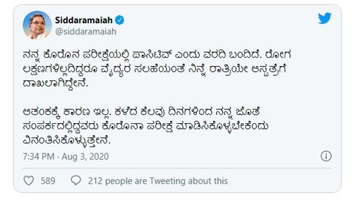 ಈ ಬಗ್ಗೆ ಖುದ್ದು ಟ್ವೀಟ್ ಮಾಡಿರುವ ಮಾಜಿ ಸಿಎಂ ಸಿದ್ಧರಾಮಯ್ಯ, ‘ನನ್ನ ಕೊರೊನ ಪರೀಕ್ಷೆಯಲ್ಲಿ ಪಾಸಿಟಿವ್ ಎಂದು ವರದಿ ಬಂದಿದೆ. ರೋಗ ಲಕ್ಷಣಗಳಿಲ್ಲದಿದ್ದರೂ ವೈದ್ಯರ ಸಲಹೆಯಂತೆ ನಿನ್ನೆ ರಾತ್ರಿಯೇ ಆಸ್ಪತ್ರೆಗೆ ದಾಖಲಾಗಿದ್ದೇನೆ. ಆತಂಕಕ್ಕೆ ಕಾರಣ ಇಲ್ಲ. ಕಳೆದ ಕೆಲವು ದಿನಗಳಿಂದ ನನ್ನ ಜೊತೆ ಸಂಪರ್ಕದಲ್ಲಿದ್ದವರು ಕೊರೊನಾ ಪರೀಕ್ಷೆ ಮಾಡಿಸಿಕೊಳ್ಳಬೇಕೆಂದು ವಿನಂತಿಸಿಕೊಳ್ಳುತ್ತೇನೆ’ಎಂದು ಬರೆದುಕೊಂಡಿದ್ದಾರೆ.