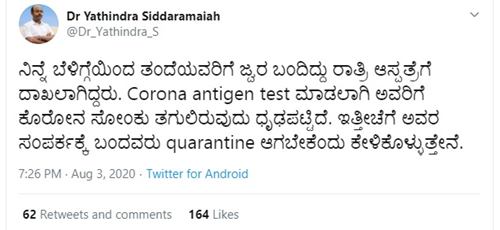 ಇನ್ನು ಸಿದ್ಧರಾಮಯ್ಯ ಪುತ್ರ ಡಾ. ಯತೀಂದ್ರ ಟ್ವೀಟ್ ಮಾಡಿ, ‘ನಿನ್ನೆ ಬೆಳಿಗ್ಗೆಯಿಂದ ತಂದೆಯವರಿಗೆ ಜ್ವರ ಬಂದಿದ್ದು ರಾತ್ರಿ ಆಸ್ಪತ್ರೆಗೆ ದಾಖಲಾಗಿದ್ದರು. ಕೊರೋನಾ ಆಂಟಿಜನ್ ಟೆಸ್ಟ್ ಮಾಡಲಾಗಿ ಅವರಿಗೆ ಕೊರೋನ ಸೋಂಕು ತಗುಲಿರುವುದು ಧೃಢಪಟ್ಟಿದೆ. ಇತ್ತೀಚೆಗೆ ಅವರ ಸಂಪರ್ಕಕ್ಕೆ ಬಂದವರು ಕ್ವಾರೆಂಟೈನ್ ಆಗಬೇಕೆಂದು ಕೇಳಿಕೊಳ್ಳುತ್ತೇನೆ’ ಎಂದು ಬರದುಕೊಂಡಿದ್ದಾರೆ.