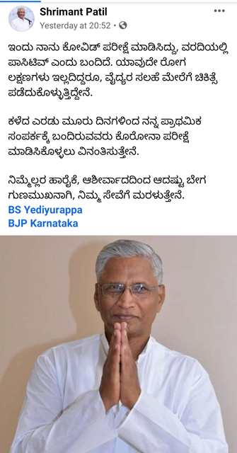 ಈ ಬಗ್ಗೆ ಫೇಸ್ ಬುಕ್ ನಲ್ಲಿ ಬರೆದುಕೊಂಡಿರುವ ಶ್ರೀಮಂತ ಪಾಟೀಲ್, ನಾನು ಕೋವಿಡ್ ಪರೀಕ್ಷೆ ಮಾಡಿಸಿದ್ದು, ವರದಿಯಲ್ಲಿ ಪಾಸಿಟಿವ್ ಎಂದು ಬಂದಿದೆ. ಯಾವುದೇ ರೋಗ ಲಕ್ಷಣಗಳು ಇಲ್ಲದಿದ್ದರೂ, ವೈದ್ಯರ ಸಲಹೆ ಮೇರೆಗೆ ಚಿಕಿತ್ಸೆ ಪಡೆದುಕೊಳ್ಳುತ್ತಿದ್ದೇನೆ. ಕಳೆದ ಎರಡು ಮೂರು ದಿನಗಳಿಂದ ನನ್ನ ಪ್ರಾಥಮಿಕ ಸಂಪರ್ಕಕ್ಕೆ ಬಂದಿರುವವರು ಕೊರೋನಾ ಪರೀಕ್ಷೆ ಮಾಡಿಸಿಕೊಳ್ಳಲು ವಿನಂತಿಸುತ್ತೇನೆ. ನಿಮ್ಮೆಲ್ಲರ ಹಾರೈಕೆ, ಆಶೀರ್ವಾದದಿಂದ ಆದಷ್ಟು ಬೇಗ ಗುಣಮುಖನಾಗಿ, ನಿಮ್ಮ ಸೇವೆಗೆ ಮರಳುತ್ತೇನೆ ಎಂದು ಹೇಳಿದ್ದಾರೆ.