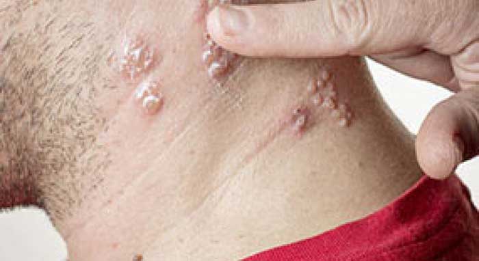 ತ್ವಚೆ ಮೇಲೆ ಕೆಂಪನೆ ಚಿಕ್ಕಚಿಕ್ಕ ನೀರ್ಗುಳ್ಳೆಗಳು ಪಟ್ಟೆಯಾಕಾರದಲ್ಲಿ ದೇಹದ ಒಂದು ಪಾರ್ಶ್ವದಲ್ಲಿ ಕಂಡುಬರುತ್ತವೆ. ಈ ನೀರ್ಗುಳ್ಳೆಗಳು ನರತಂತುಗಳನ್ನು ಬಾಧಿಸುವುದರಿಂದ ಉರಿ, ನವೆ ಊಂಟಾಗುತ್ತವೆ. ನರತಂತುಗಳ ಜಾಲಗಳಲ್ಲಿ ಇವು ಪಸರಿಸುತ್ತವೆ. ಇದನ್ನು ಜನಸಾಮಾನ್ಯರು ಸರ್ಪದ ಚರ್ಮ ಅಥವಾ ಹೆಡೆಯ ರೂಪವನ್ನು ಕಲ್ಪಿಸಿಕೊಂಡು, ಸರ್ಪ ದೋಷದಿಂದ ಬರುವ ಸಮಸ್ಯೆ ಎಂದು ಪರಿಗಣಿಸುತ್ತಾರೆ, ಸರ್ಪದ ಬಗ್ಗೆ ಇರುವ ಸಹಜ ಭಯ ಮತ್ತು ದೇವತಾರೂಪಿ ನಂಬಿಕೆಯಿಂದ ದೇವರು ಮುನಿದ ಎಂಬ ಆತಂಕದ ಛಾಯೆ ಆವರಿಸುವುದೂ ಉಂಟು. ಇದಕ್ಕಾಗಿ ಸರ್ಪದೋಷ ಪರಿಹಾರ ಅಥವಾ ರೋಗ ವಾಸಿ ಮಾಡುವ ಅವೈಜ್ಞಾನಿಕ ವಿಧಾನಗಳನ್ನು ಅನುಸರಿಸುತ್ತಾರೆ. ಇದರಿಂದ ಕಾಯಿಲೆ ವಾಸಿಯಾಗುವುದರ ಬದಲು, ಉಪದ್ರವ ಜಾಸ್ತಿಯಾಗುತ್ತದೆ.