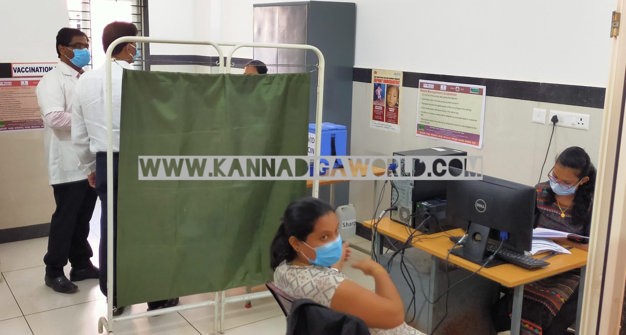 ಆಸ್ಪತ್ರೆ ಶುಶ್ರೂಷಾಧಿಕಾರಿ ಗಾಯತ್ರಿ ಅವರಿಗೆ ಮೊದಲ ಲಸಿಕೆ ನೀಡಲಾಯಿತು.