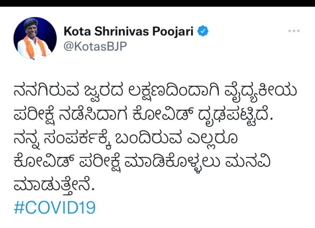 ಜ್ವರದ ಲಕ್ಷಣವಿದ್ದ ಹಿನ್ನೆಲೆ ಪರೀಕ್ಷೆ; ಸಚಿವ ಕೋಟ ಶ್ರೀನಿವಾಸ ಪೂಜಾರಿ ಅವರಿಗೆ ಕೊರೋನಾ ಪಾಸಿಟಿವ್