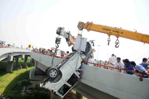 “As the first step we diverted traffic from the road. We stopped commercial vehicles to provide support to the vehicle from underneath and then called two private cranes to hold the vehicle from the front. After it was ensured that the vehicle would not fall, we pressed into service a hydraulic lift used to repair electric poles to pull out Vinita Sidhana (40), her son Sanik Sidhana (18) and friend Bhagya Narain Dubey (30), who were sitting in back of the vehicle,” said Mr. Sharma.