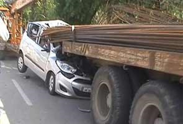 Noida: Iron rods protruding from a truck near Delhi pierced through a car when it rear-ended the truck, killing one and injuring two others. (Pics)