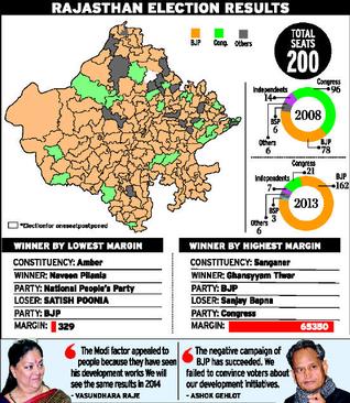 The biggest margin of victory was registered by the BJP leader and former Minister, Ghanshyam Tiwari, who trounced Congress candidate Sanjay Bapna in Sanganer by 62,832 votes. The Congress polled 33.68 per cent of the total votes.