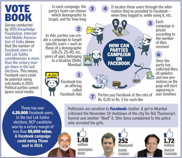 A study, a copy of which is with The Hindu, has, for the first time, shown how social media can affect the results of the next Lok Sabha elections. Conducted by the IRIS Knowledge Foundation and the Internet and Mobile Association of India, the research claims that results in over 150 constituencies could be decided by ‘Facebook users, making them the newest vote-bank with the power to shape Indian politics.’