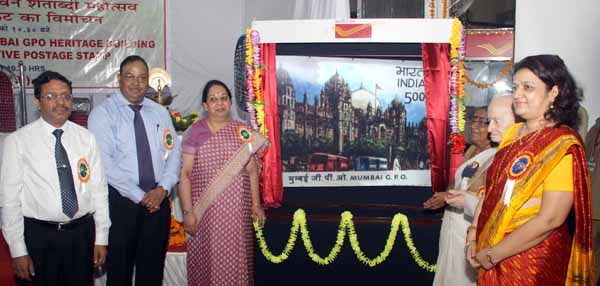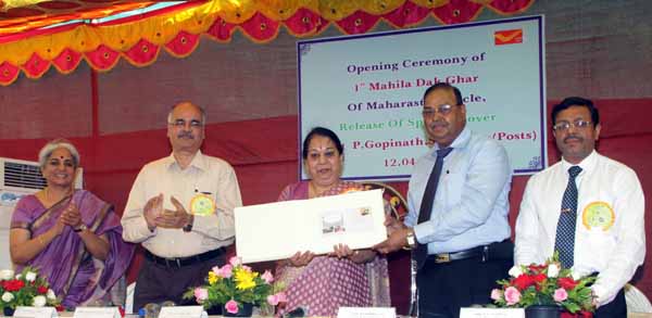 Mumbai April 14 :- Release of Special Cover on First Mahila Dak Ghar, Town Hall Post Office, Mumbai. Left to Right- Mrs. Usha Thorat, Former Dy.Governor RBI, Shri.Chandrashekhar Oak Collector Mumbai City, Ms.P.Gopinath Secretary(P), Col K C Mishra, VSM, CPMG,Shri.H.C.Agrawal.