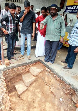 The excavations by the Archaeology Department were launched after the unearthing of a set of three steps and a nearby structure that is suspected to be a passageway or drain filled up with mud and sand about 100 metres from the northern entrance of the temple on Thursday. The discoveries were made when workers began digging a trench, which is now about five feet deep, for the installation of electro-hydraulic bollards and other security apparatus by the police on the road leading to the temple.