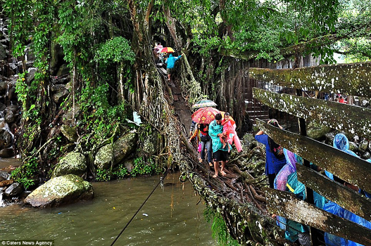 Ancient: The 30 metre bridge took 26 years to fully form over the Bayang River and has been used ever since for the last 100 years